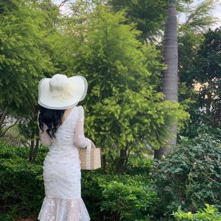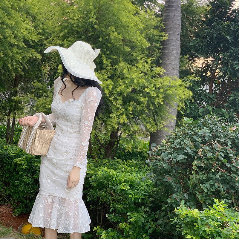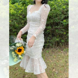 新款egg2020夏 季桔梗法式仙女蕾丝刺绣鱼尾修身连衣裙